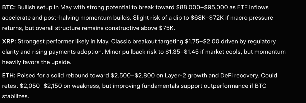 The post Elon Musk Grok AI Predicts the Price of XRP, Bitcoin and Ethereum by The End of May 2026 appeared first on Cryptonews.