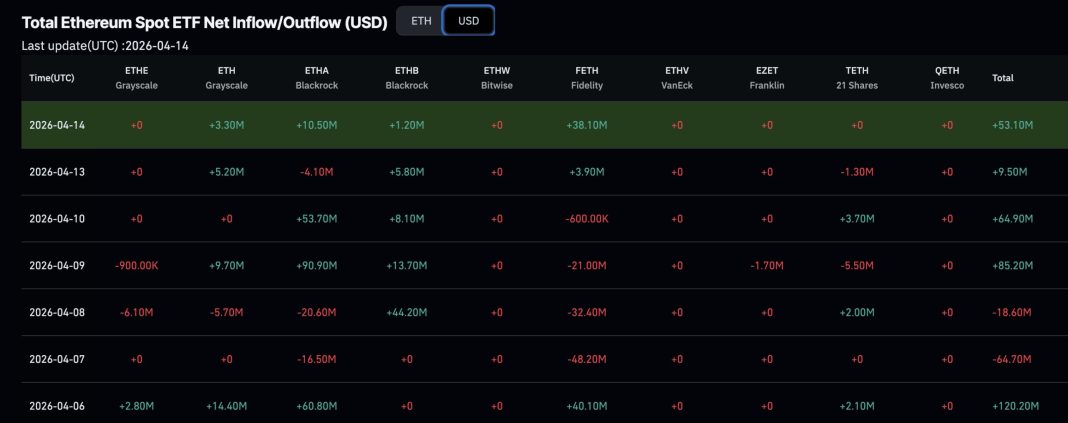U.S. spot Ethereum ETFs recorded net inflows on April 14, 2026, pulling in $53 million with zero funds posting outflows. Fidelity’s FETH led all products at +$38.06 million, followed by BlackRock’s ETHA at +$10.49 million, Grayscale’s Mini ETH at +$3.29 million, and BlackRock’s staking product ETHB at +$1.19 million.
