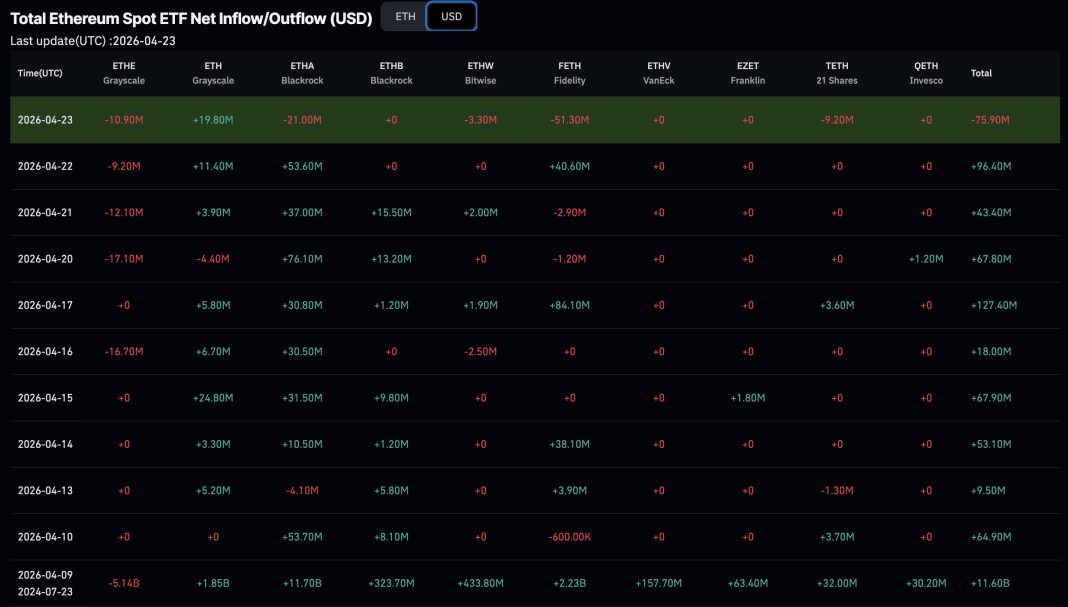 Spot Ethereum ETFs recorded a net outflow of $75.9 million on April 23, abruptly ending a 10-day consecutive inflow run. Yesterday’s compares poorly with the prior session’s $96.4 million in ETH ETF inflows. Yesterday was a $172.3 million single-day swing in the wrong direction.